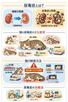 猫の尿毒症は、慢性腎臓病・急性腎障害・尿路閉塞などが原因で起こる危険な状態です。