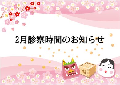 2月診察時間のお知らせ 2026年1月20日 (火) カテゴリー:お知らせ 2月の診察時間のお知らせです。 2月1日(日)と2月11日(水)は午後が休診となります。 ご不便をおかけしますが、よろしくお願いいたします。 一覧へ戻る 次へ
