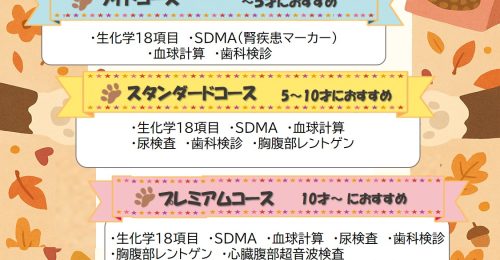 10がつ1日から秋の健康診断キャンペーンが始まります。 通常よりお得に受けられる各種コースを用意しています。 ★10月中に受けられた方にはそれぞれの子に合ったフードのサンプルをプレゼント!! この機会にぜひ検診を受けて大事な家族の健康状態をしっかり確認しましょう。